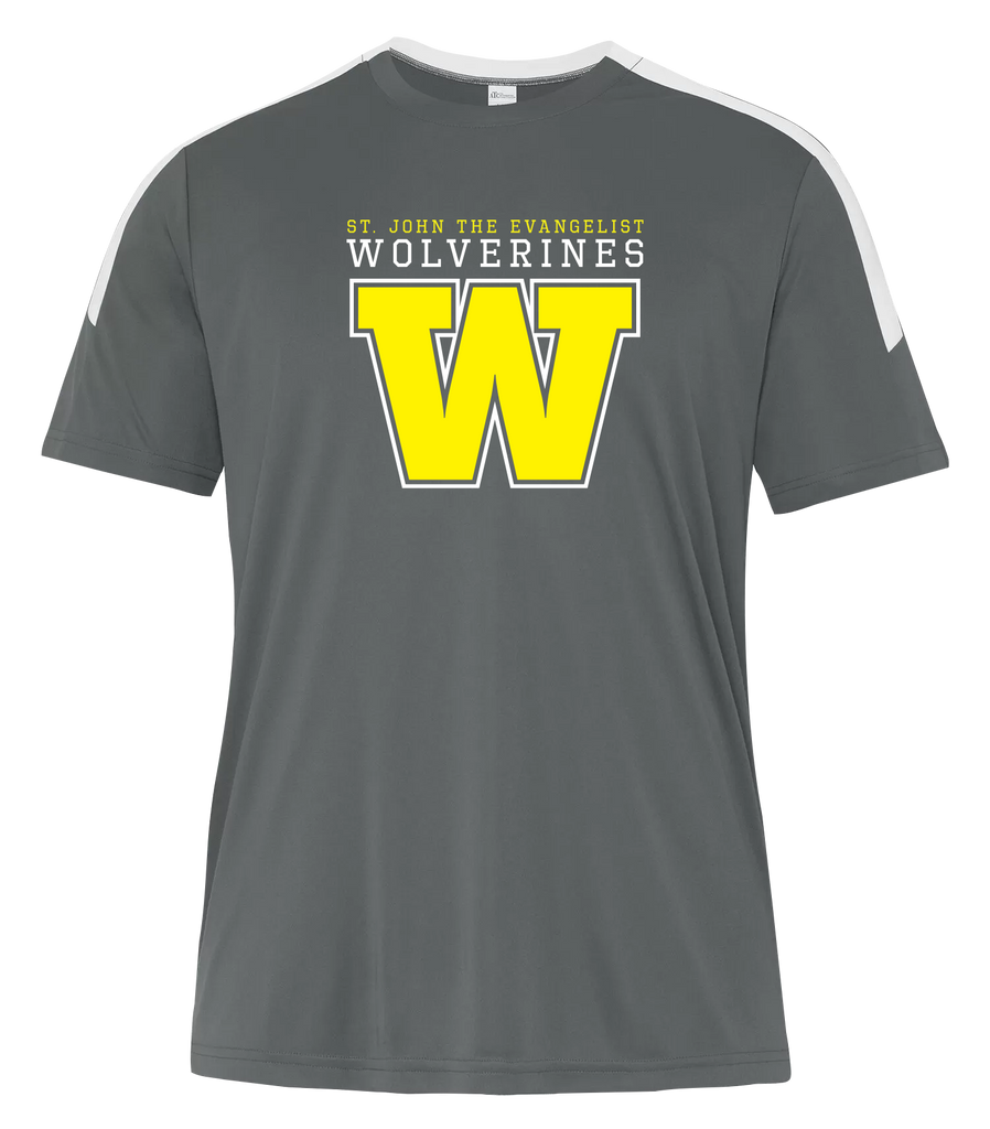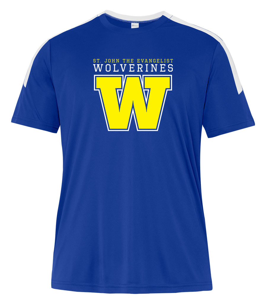 • 6.3-oz, 100% performance polyester interlock with wicking technology